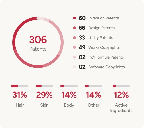 Opal Cosmetics Group has registered a total of 306 patents, including 60 invention patents, 33 utility model patents, and 66 design patents, and has more than 20,000 formula reserves.